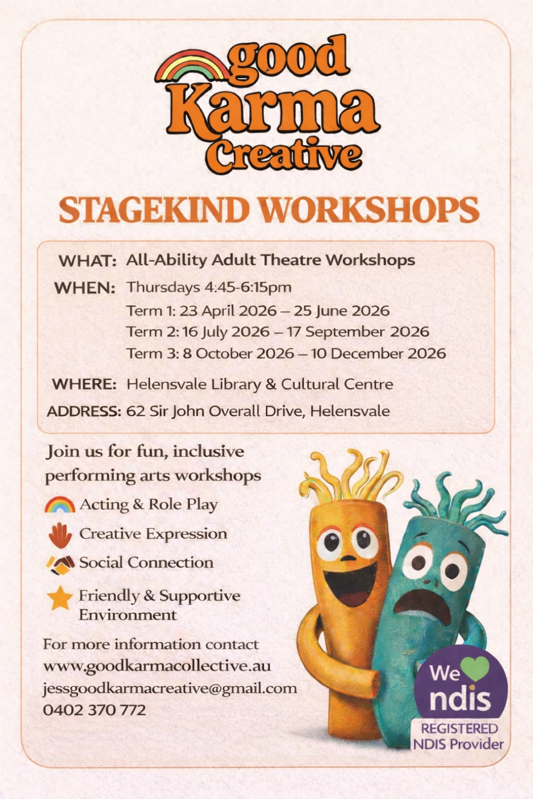 Expand your knowledge and skills with our interactive accessible theatre workshops. No experience needed and everyone is welcome to our safe and inclusive classes Unleash your creativity! Call 0402370772